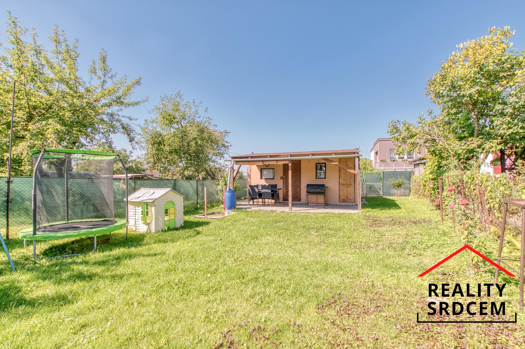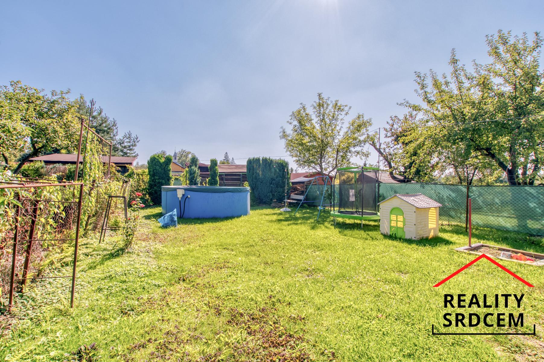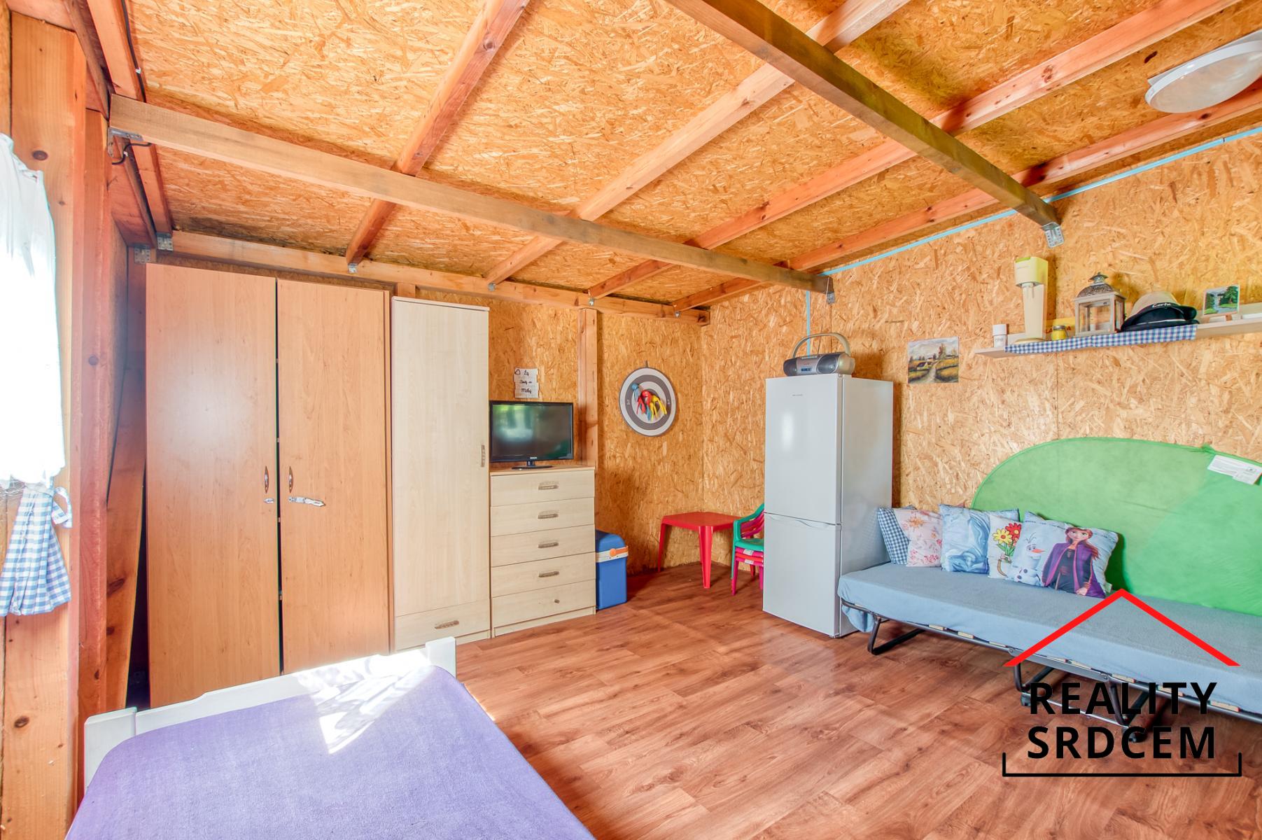 Chata zůstává vybavená - postel, skříň, venkovní posezení, trampolína i bazén. Posezení na chatě je orientováno na jihovýchod, takže v létě zde bude příjemné posezení a na bazén svítí sluníčko po celý den. Na zahradě je možné vybudovat například záhony nebo zasadit ovocné keře.