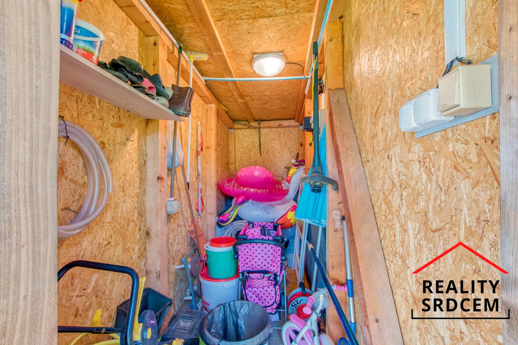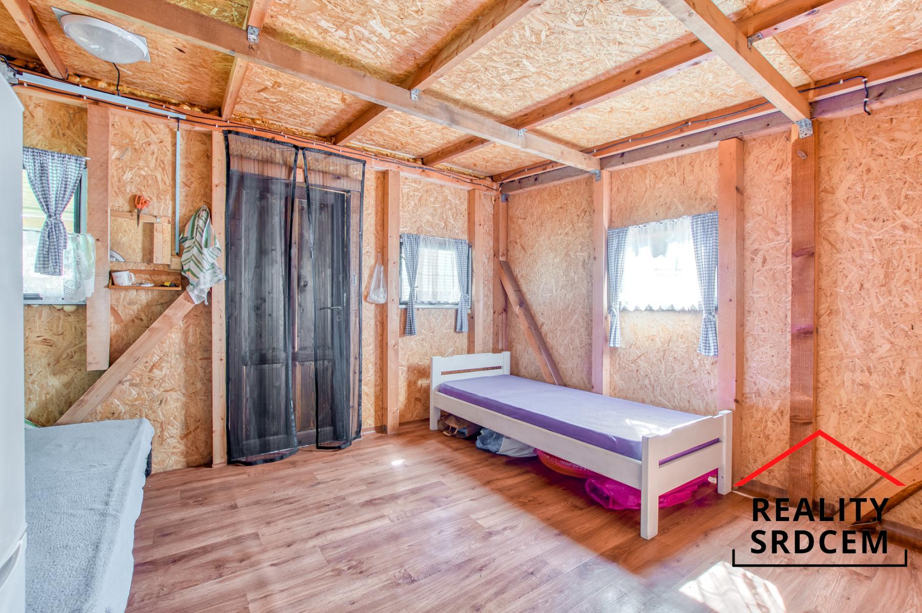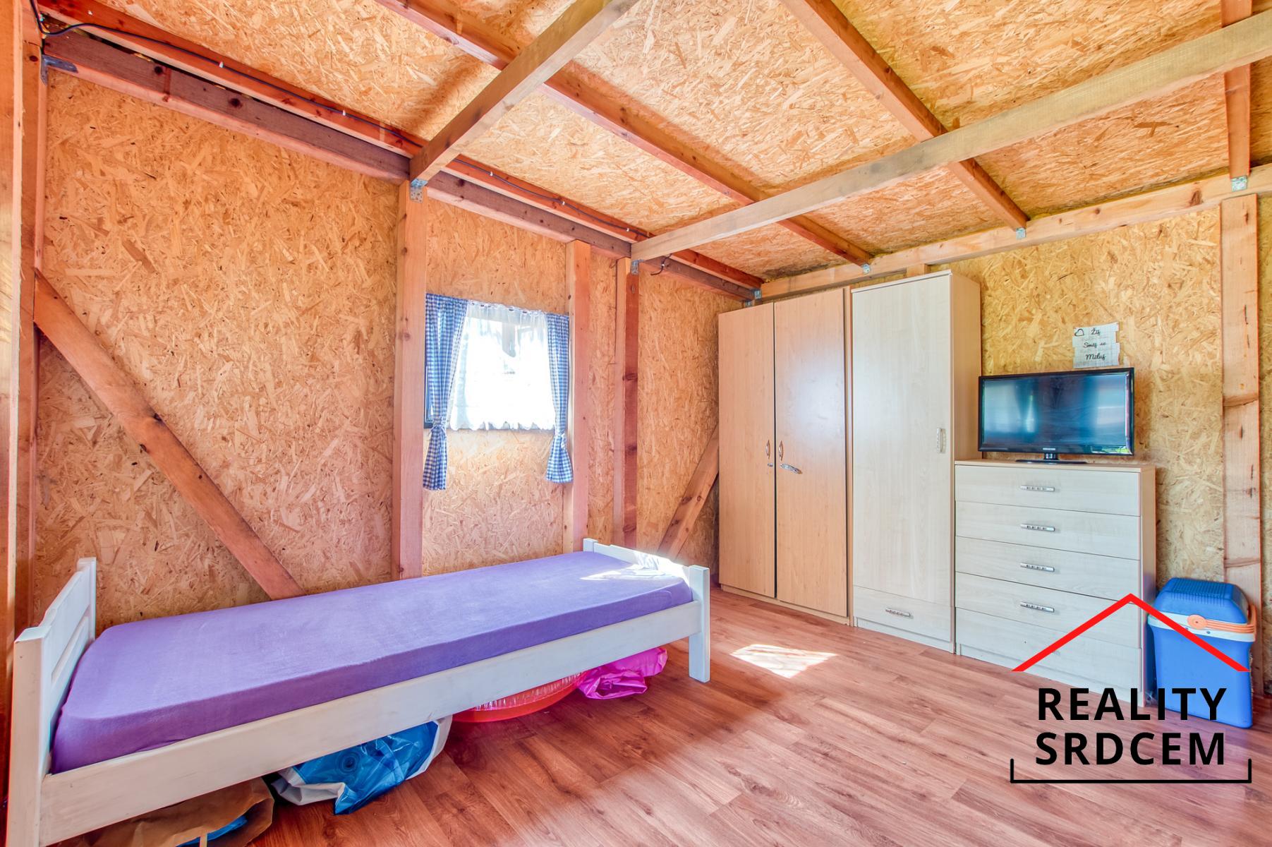 Chata zůstává vybavená - postel, skříň, venkovní posezení, trampolína i bazén. Posezení na chatě je orientováno na jihovýchod, takže v létě zde bude příjemné posezení a na bazén svítí sluníčko po celý den. Na zahradě je možné vybudovat například záhony nebo zasadit ovocné keře.