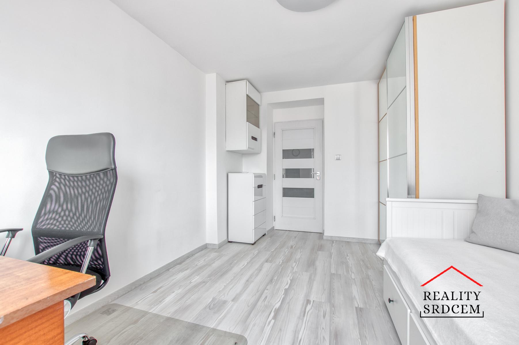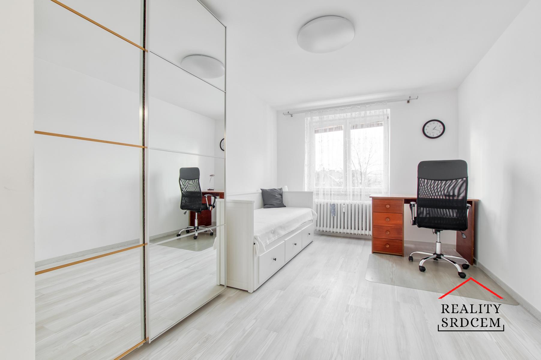 V prvním pokoji je nová rozkládací dvoulůžková pohovka IKEA s lamelovým roštem a matracemi, noční stolek s lampičkou, psací stůl, kancelářské křeslo, velká šatní skříň PAX IKEA s posuvnými dveřmi se zrcadly, komoda a menší vitrína na zdi.