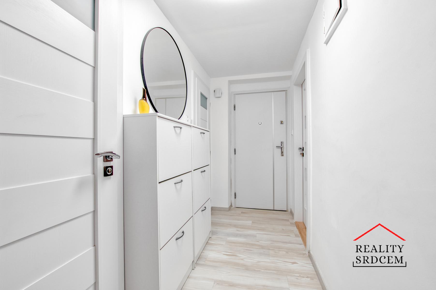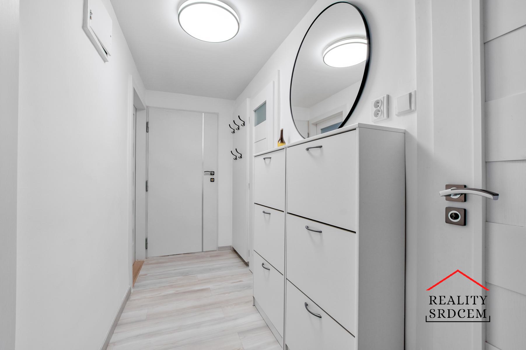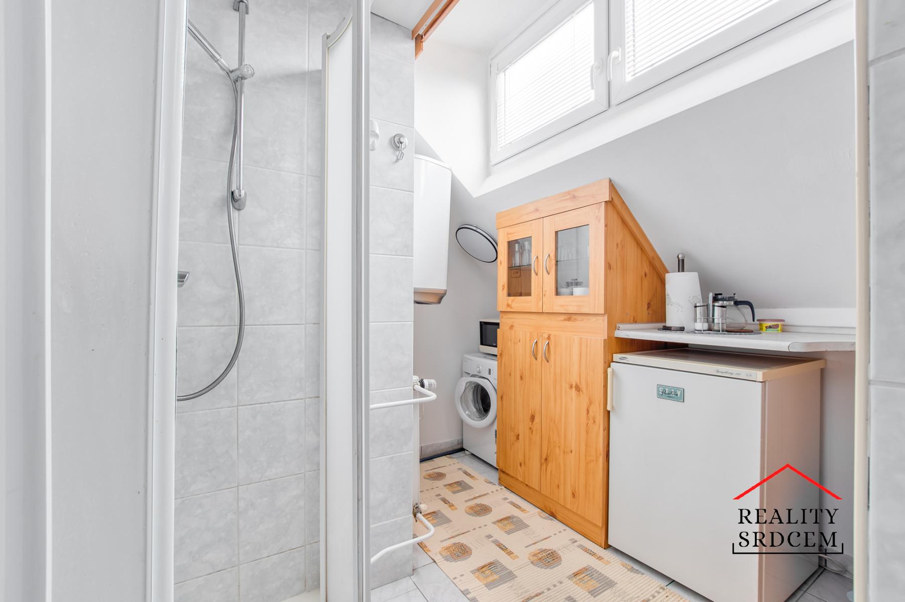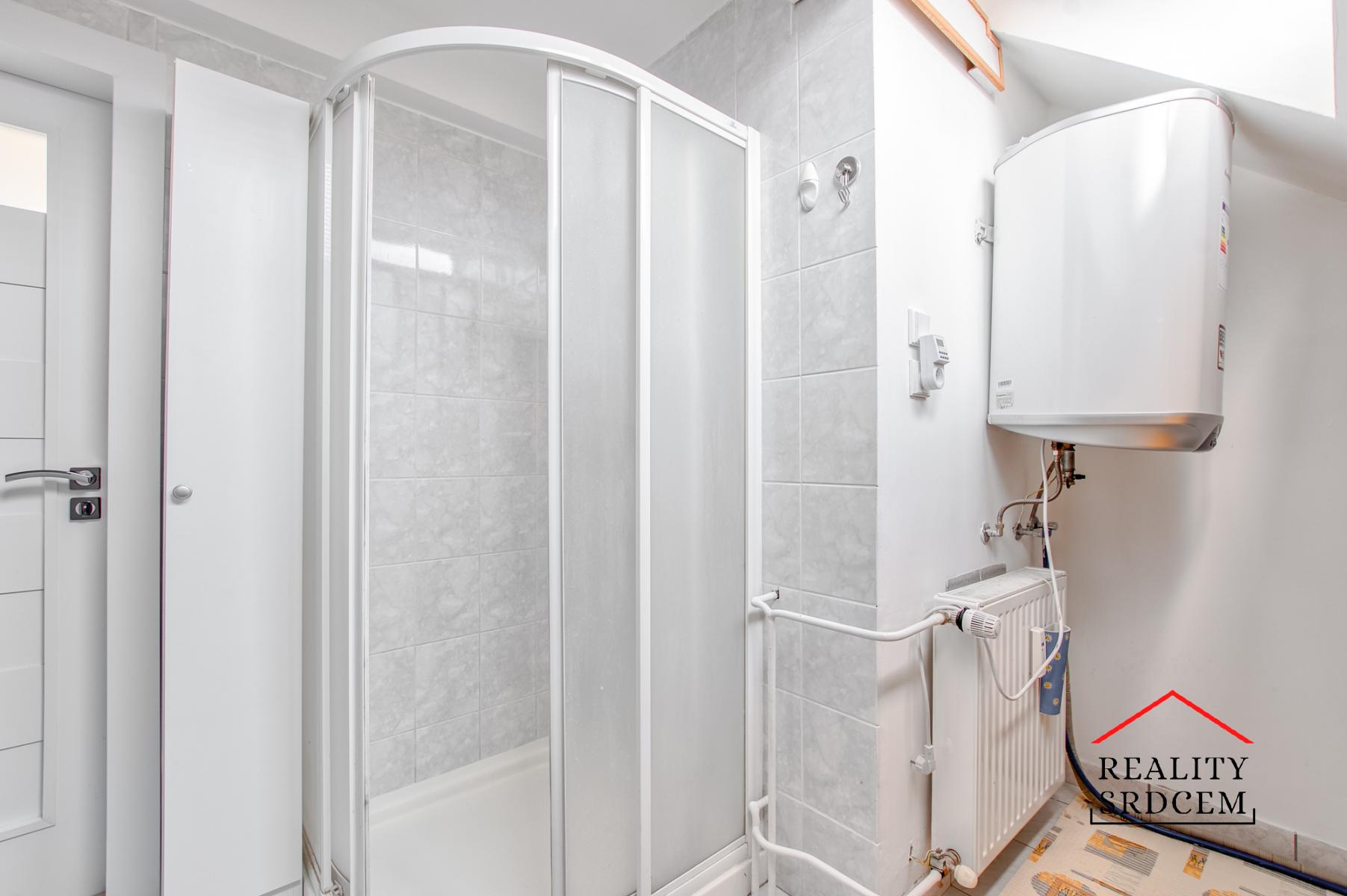 Rekonstruované WC je samostatně, stejně jako koupelna (umyvadlo a prostorný sprchový kout). Ve vstupní chodbě je botník se zrcadlem.